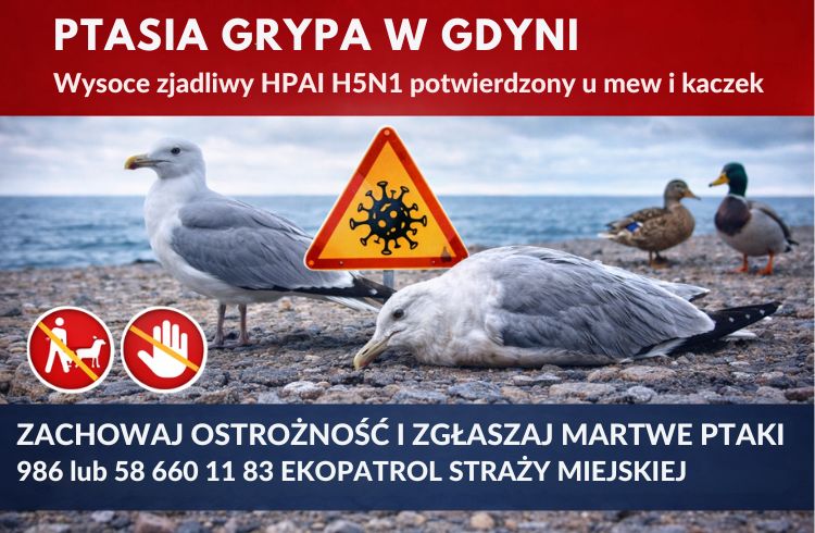 Na terenie Gdyni potwierdzono laboratoryjnie pierwsze w tym roku przypadki wysoce zjadliwej grypy ptaków (HPAI) podtypu H5N1. Choroba została stwierdzona m.in. u mew srebrzystych, mew siwych, kaczek oraz kormoranów. Powiatowy Lekarz Weterynarii w Gdyni, w uzgodnieniu z Wojewodą Pomorskim, wyznaczy strefę objętą zakażeniem, co będzie wiązało się z określonymi nakazami i zakazami.