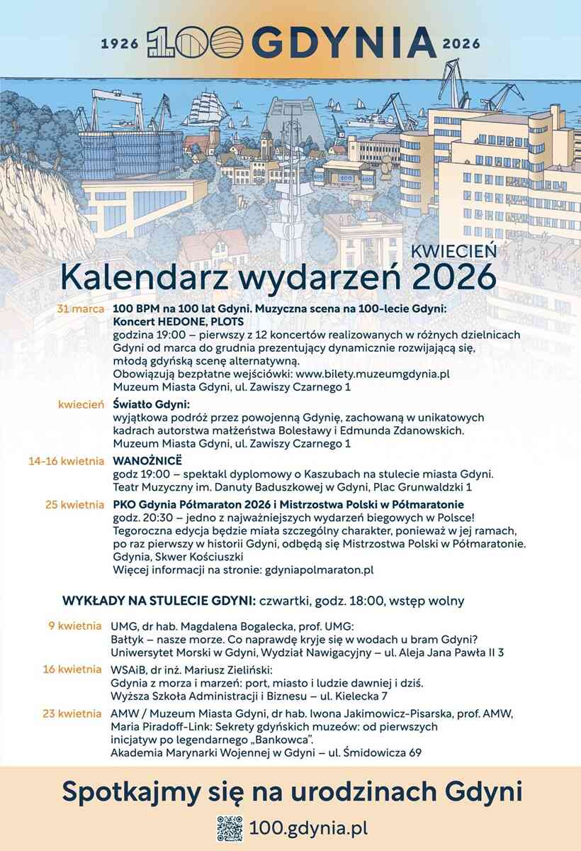 Rok 2026 to dla Gdyni czas szczególny – miasto świętuje swoje setne urodziny. Z tej okazji kwiecień wypełni się wydarzeniami, które łączą historię, kulturę i sportowe emocje. Od nastrojowych wystaw fotograficznych, przez fascynujące wykłady naukowe, aż po Mistrzostwa Polski w Półmaratonie – każdy znajdzie coś dla siebie w urodzinowym grafiku Miasta Gdynia.