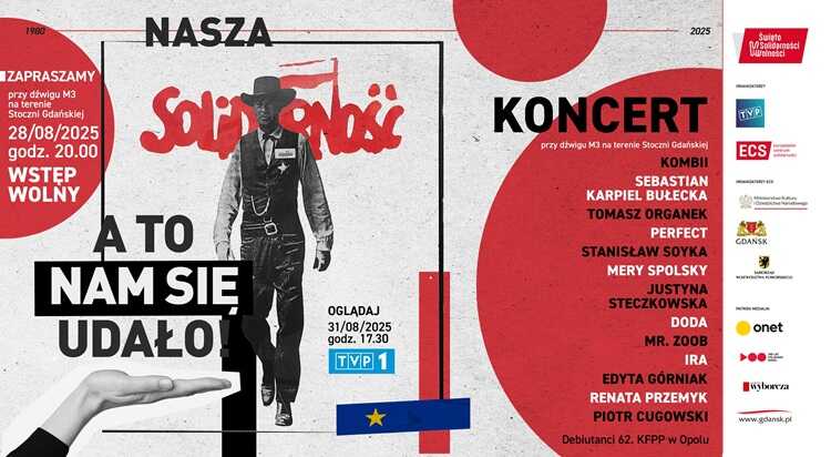 Telewizja Polska, Europejskie Centrum Solidarności oraz miasto Gdańsk zapraszają na koncert „Nasza Solidarność. A to nam się udało!”, który odbędzie się w czwartek, 28 sierpnia o godz. 20:00 na terenie Stoczni Gdańskiej, przy dźwigu M3. Wydarzenie w historycznej przestrzeni, z udziałem polskich gwiazd, uświetni jubileusz powstania Solidarności. Wstęp wolny.